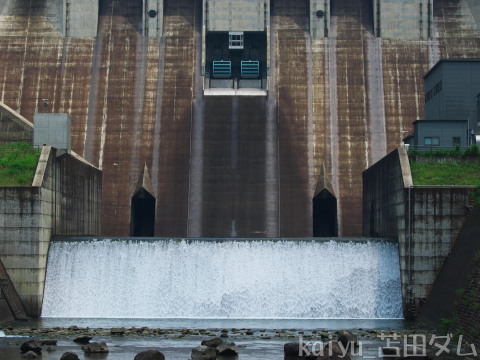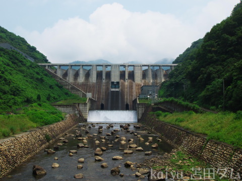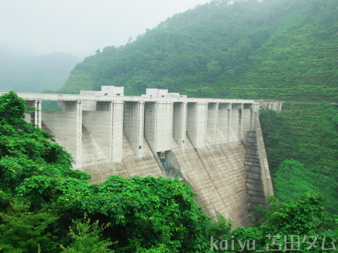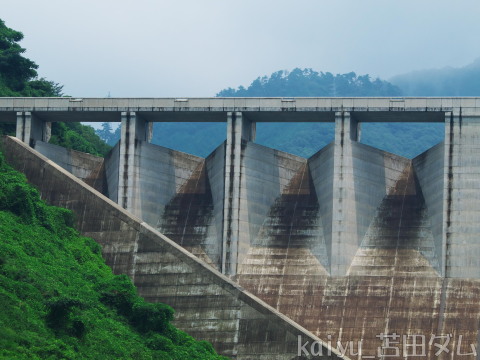 右岸から眺めるとその形に驚かされます。ダムカードによると、ラビリンス形自由越流頂の採用は国内初とのこと。