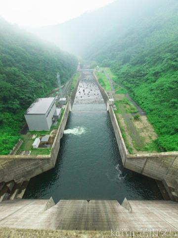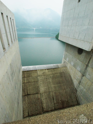 天端から下流を眺める。このときは雨が降って遠くまで見えませんでした。