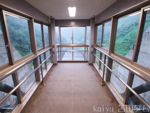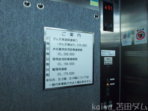 堤体中央部にあるエレベーターも開放されていて、放流設備を見学することができます。堤体下部までは降りることはできないようです。
