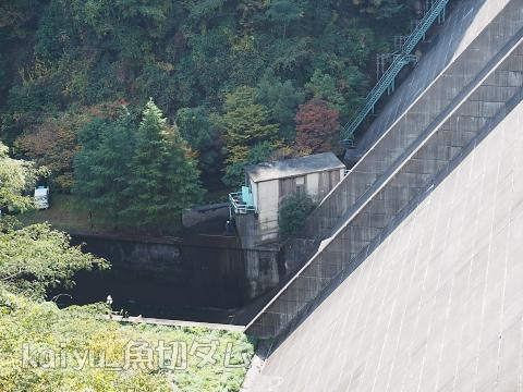 右岸側の放流設備です。ドアが開いて点検中のようです。