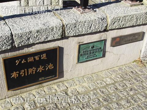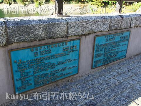 堤体左岸には、ダム湖百選、国指定重要文化財、近代化産業遺産のプレートが並びます。