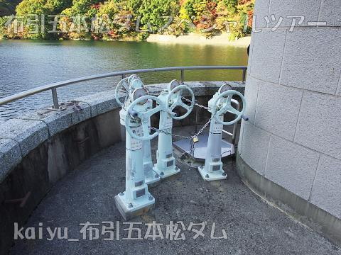天端には、取水口の弁を操作するためのハンドルが並んでいます。