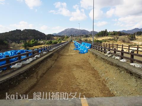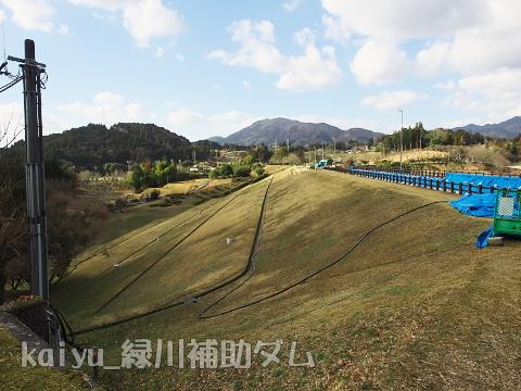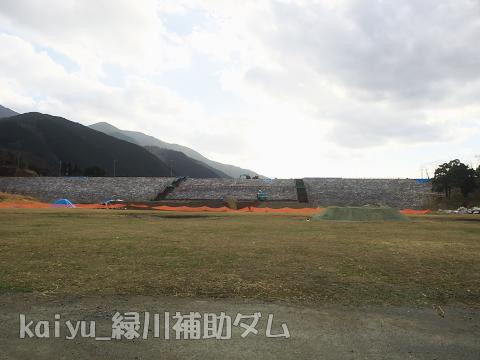 2017年2月に訪ねました。緑川補助ダム。緑川ダムの脇ダムとなります。苫田鞍部ダムのように堤高が15mを越えるため、ダムとして扱われています。緑川ダム堤体から少し離れた位置にあるロックフィルダムです。緑川ダムが水をためる際に必要となるダムのため、洪水吐きなどはないようです。下流面は芝に覆われています。所々に見えるものは堤体の観測装置のようです。