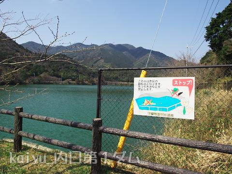 堤体は、アースダム。この日は貯水位が高く見えないですが、水面下には石が貼ってあるようです。
