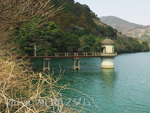 取水塔とその向こうに見えるのが余水吐きです。時間がなくて見ていない余水吐きは次回詳しく見ることにします。(というか、堤体が気になって余水吐き忘れてた・・・)