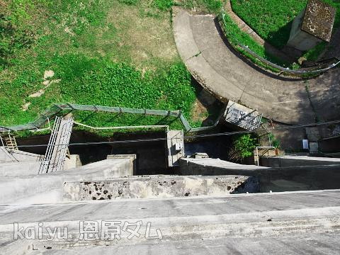 堤体下部を覗きます。なんとか柱と梁が確認できました。中央下部には河川維持のための放流を行う施設が見えます。