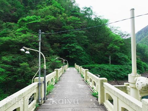 上流側から望みます。橋脚にも穴があるのと、越流部分にワイヤーが張ってありました。コンクリートの風合いから近年改修がされたようです。