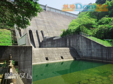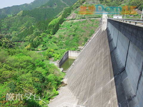 下流側。下流には吊り橋が見える。堤体下部には車で進入可能。