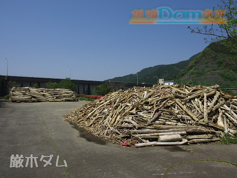 堤体左岸にある階段を降りると、ダム湖で回収したと思われる流木がありました。