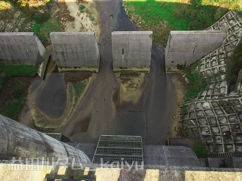 上流側のこの壁は、堤体下部にある洪水吐きが、流木などで埋まってしまわないように設置してあるようです。洪水吐きにもスクリーンが見えますね。