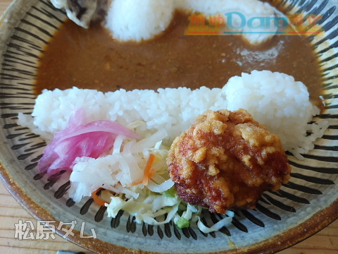 松原ダムと下筌ダムがセットになったダムカレー。日田名物のからあげも大きい。