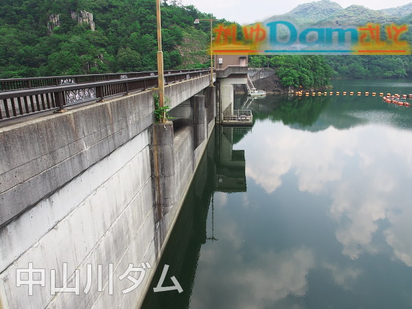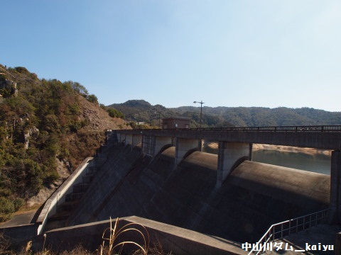 中山川ダムは県道沿いにあるダム。黒杭川ダムとつながっている県道なので黒杭川ダムと一緒に見ることができるダムである。黒杭川ダムから見ると上流方向であるが、別の川である。この写真は、ダム左岸の階段を下りた所から撮影。