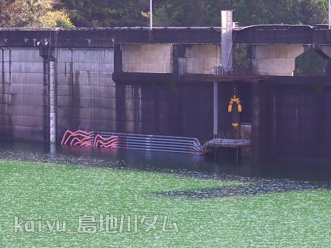 常用洪水吐きの謎のパイプがわかりました。島地川ダム管理支所が発行している「島地川ダム高瀬湖だより41号」に記事がありました。それによると選択取水設備の整備工事のため、ダム下流に水を流す代替えの仮設ポンプだったようです。クレーンが天端で作業していたのもこの工事のためだったようですね。