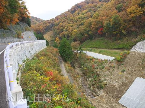 歩いて上流側に移動してみました。紅葉がきれいです。完成時には貯水池となる部分にコンクリートを作る設備が設置されていました。