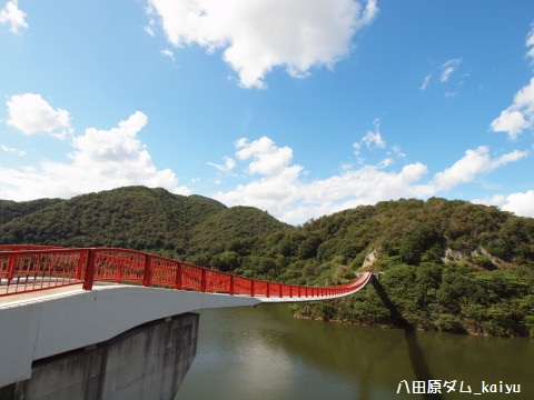 薄っぺらな橋で大丈夫か!?高原の町世羅町にある八田原ダム。貯水池に珍しい吊り橋が架かるダムです。撮影場所は、ダム直下から。全体が見える位置は探す時間がありませんでした。小屋が邪魔です!もっと下流からな...