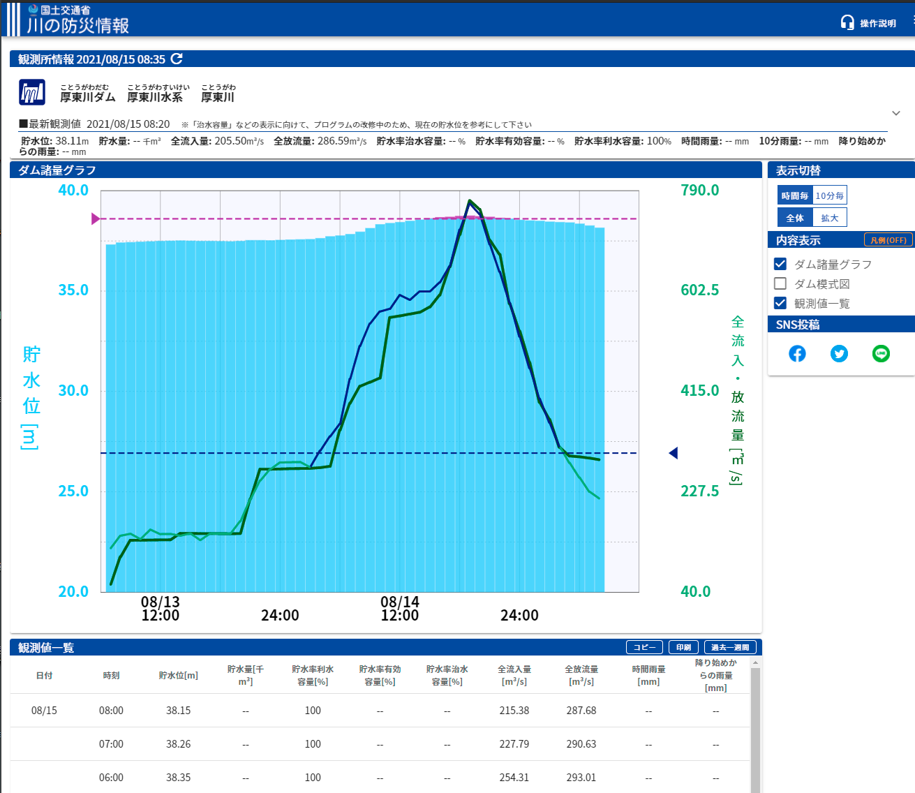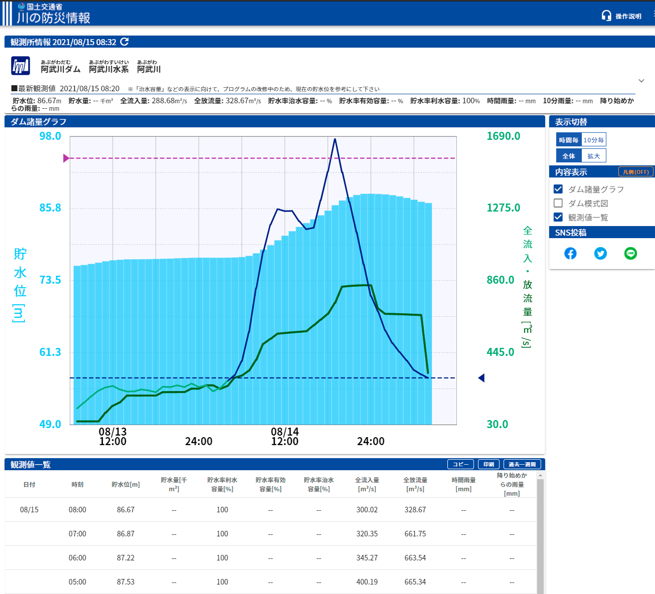 まずは、厚東川ダム。今回は異常洪水時防災操作(緊急放流)となりました。水位グラフの紫色の緊急放流(異常洪水時防災操作)判断水位あたりから放流量を流入量に合わせる操作が開始されているようです。