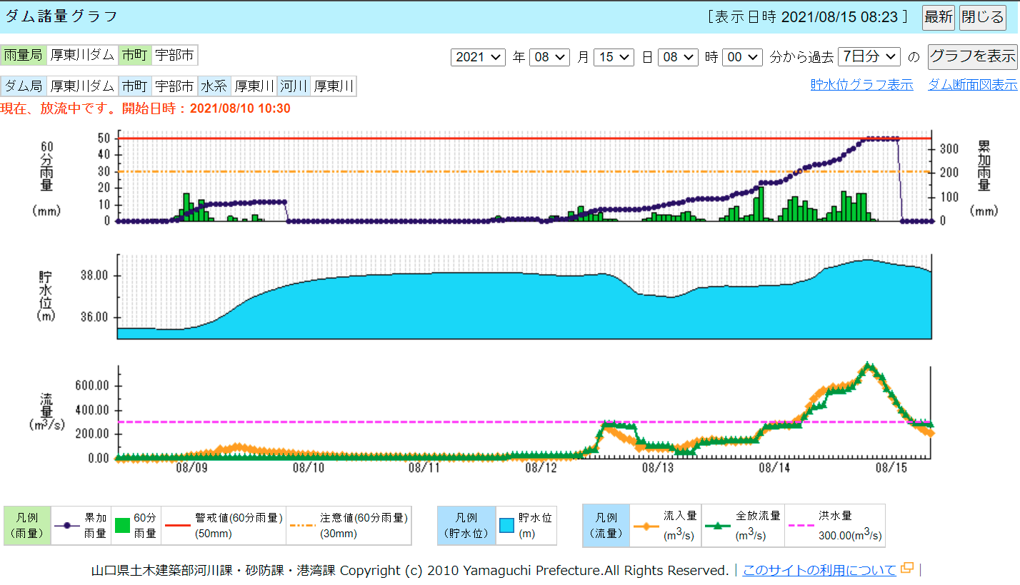 2021.08.13からの山口県内ダムの様子(8/15時点)