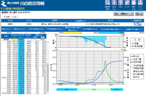 こちらは、大きなダムなので洪水をほぼ貯め込んでます。事前放流も行ったようです。詳細は関東地方整備局のページに公開されています。洪水調節効果の速報も掲載されていました。