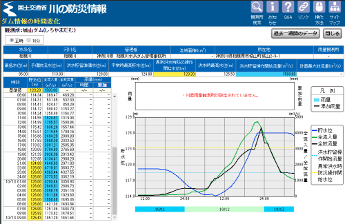 まずは、緊急放流でニュース速報が沢山流れた城山ダムの状況を川の防災情報で確認。